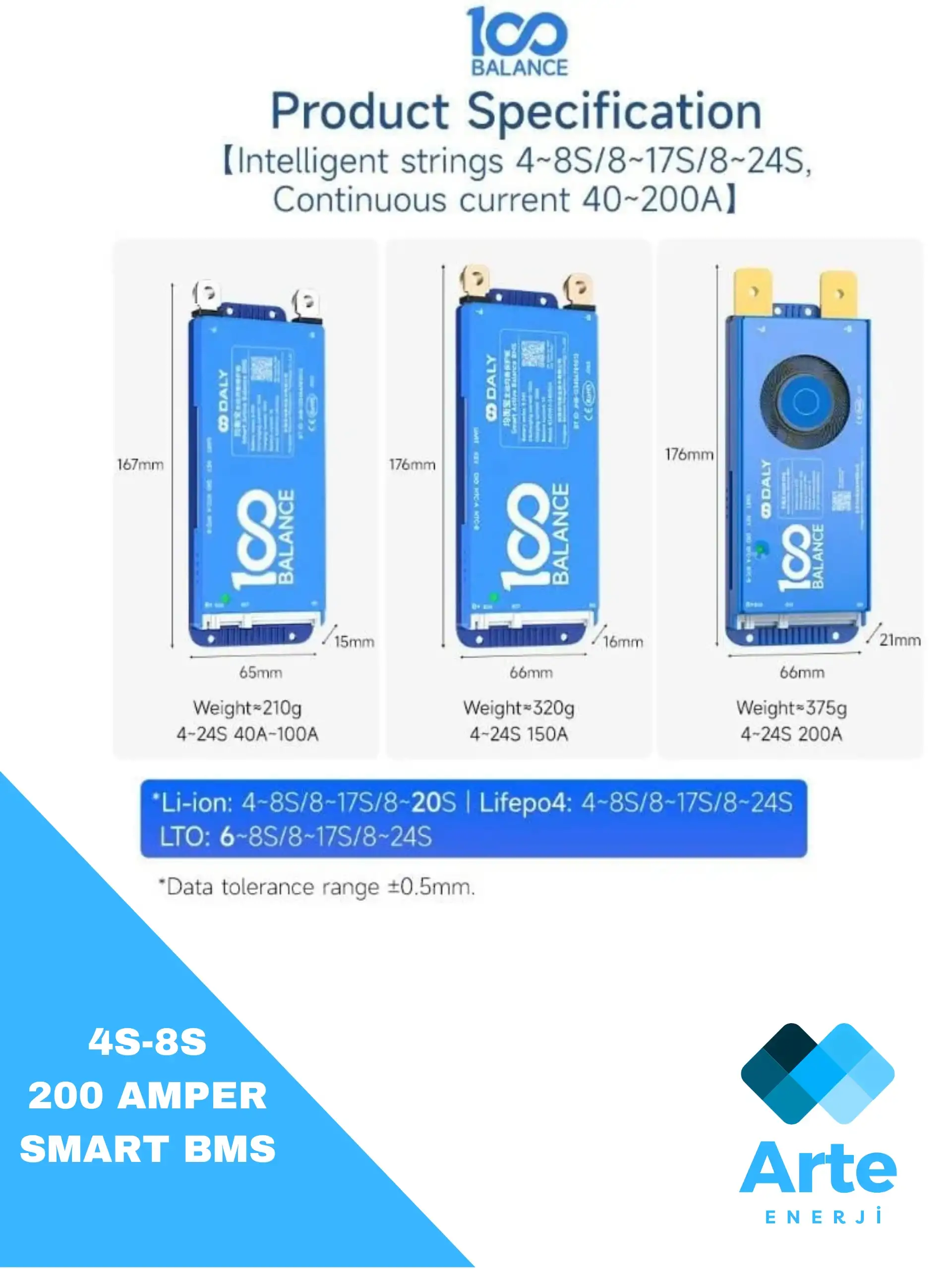 100 Balance 4‑8S 200A Smart BMS, 4 ila 8 seri hücreye sahip LiFePO₄, Li-ion ve LTO bataryalar için tasarlanmış, yüksek akım destekli ve akıllı bağlantı özellikli gelişmiş bir batarya yönetim sistemidir.