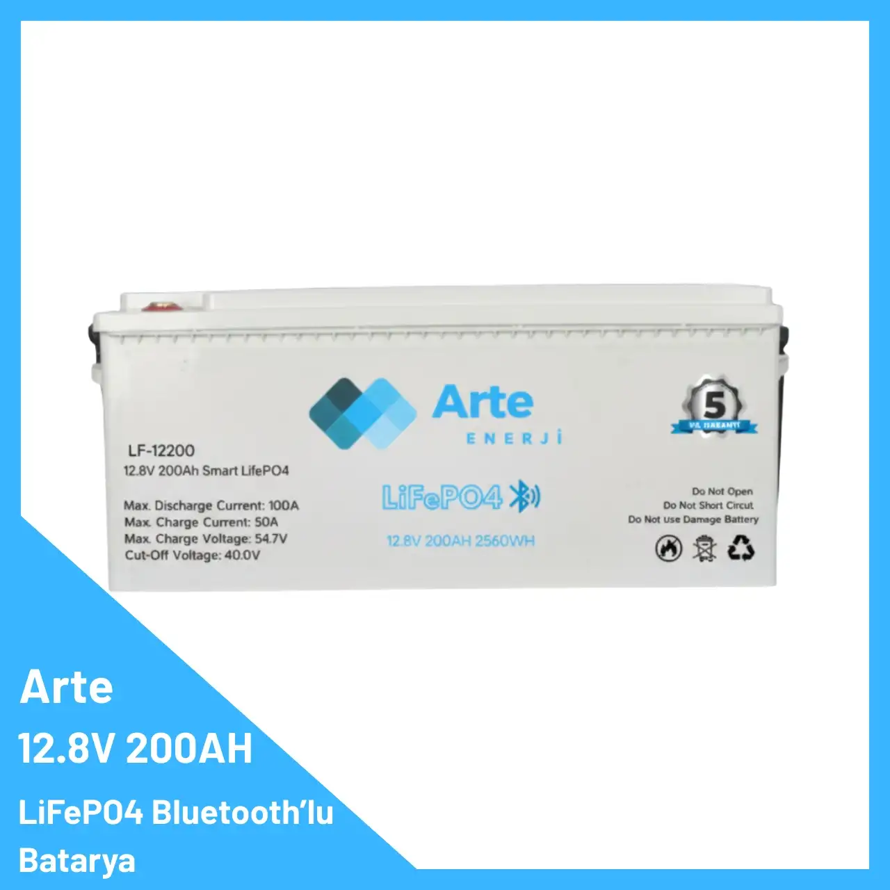 Arte 12.8V 200Ah LiFePO4 akü, 4S LiFePO4 hücre dizilimi ile 25.6V nominal kapasite sunarak toplamda 2560Wh (2.56kWh) enerji sağlar.